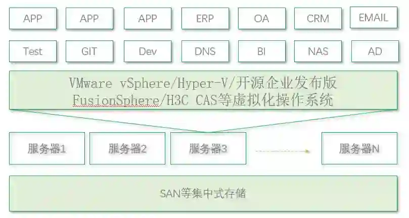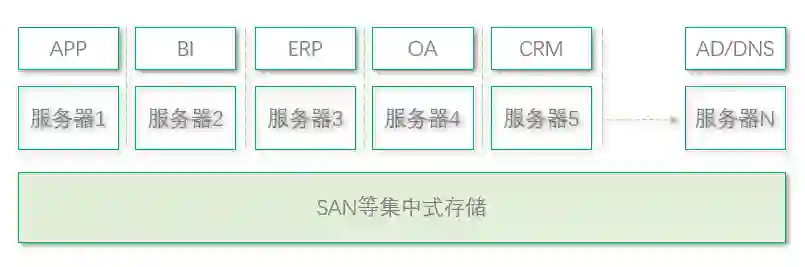 一般每台服务器上跑1-3个业务不等,各业务通过不同的安装目录和不同网络端口来隔离。所有服务器数据都存入NAS/SAN 等集中式存储。