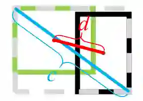 上述损失函数为DIoU的损失。其中,b,bgt分别代表了anchor框和目标框的中心点,且p代表的是计算两个中心点间的欧式距离。c代表的是能够同时覆盖anchor和目标框的最小矩形的对角线距离。因此DIoU中对anchor框和目标框之间的归一化距离进行了建模。直观的展示如下图所示。