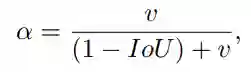 上述损失函数为CIoU的损失,通过公式可以很直观的看出,CIoU比DIoU多出了阿尔法和v这两个参数。其中阿尔法是用于平衡比例的参数。v用来衡量anchor框和目标框之间的比例一致性。