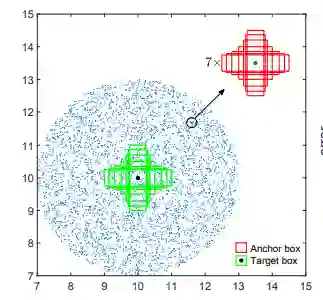 绿色框代表仿真实验需要回归的七个不同尺度的目标框,七个目标框的中心点坐标都是(10 * 10)。