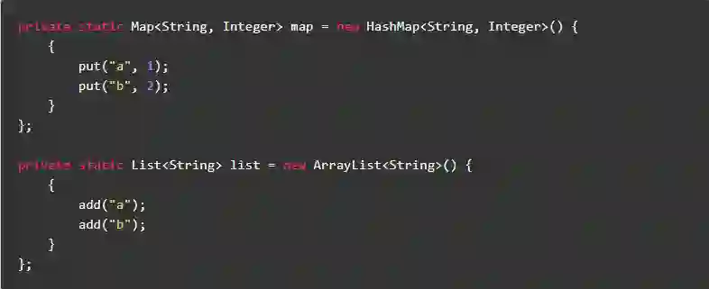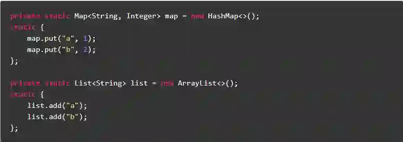 对于集合类型的静态成员变量,不要使用集合实现来赋值,应该使用静态代码块赋值。