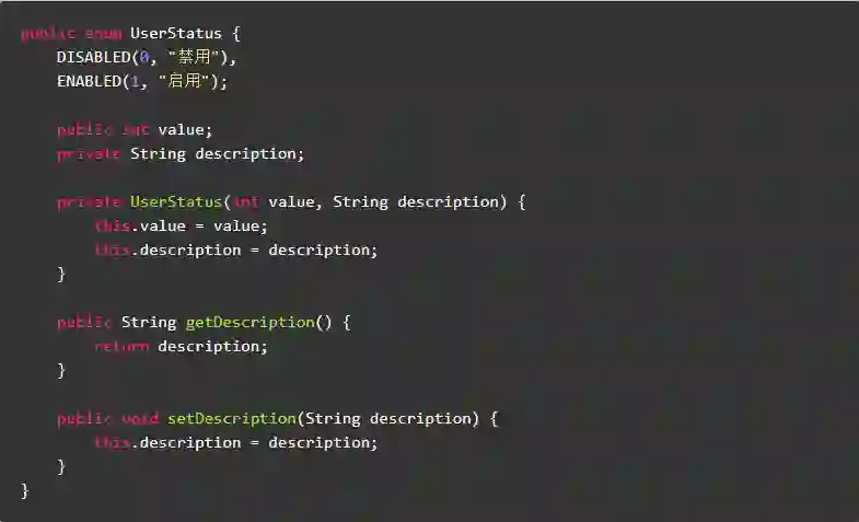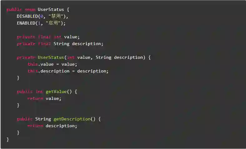 枚举通常被当做常量使用,如果枚举中存在公共属性字段或设置字段方法,那么这些枚举常量的属性很容易被修改。理想情况下,枚举中的属性字段是私有的,并在私有构造函数中赋值,没有对应的 Setter 方法,最好加上 final 修饰符。
