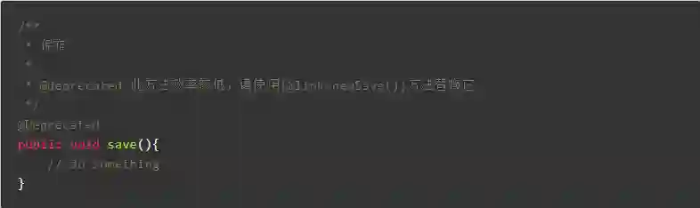 当一段代码过时,但为了兼容又无法直接删除,不希望以后有人再使用它时,可以添加 @Deprecated 注解进行标记。在文档注释中添加 @deprecated 来进行解释,并提供可替代方案