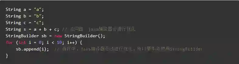 一般的字符串拼接在编译期 java 会进行优化,但是在循环中字符串拼接,java 编译期无法做到优化,所以需要使用 StringBuilder 进行替换。