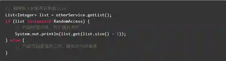 大家都知道数组和链表的区别:数组的随机访问效率更高。当调用方法获取到 List 后,如果想随机访问其中的数据,并不知道该数组内部实现是链表还是数组,怎么办呢?可以判断它是否实现 RandomAccess 接口。