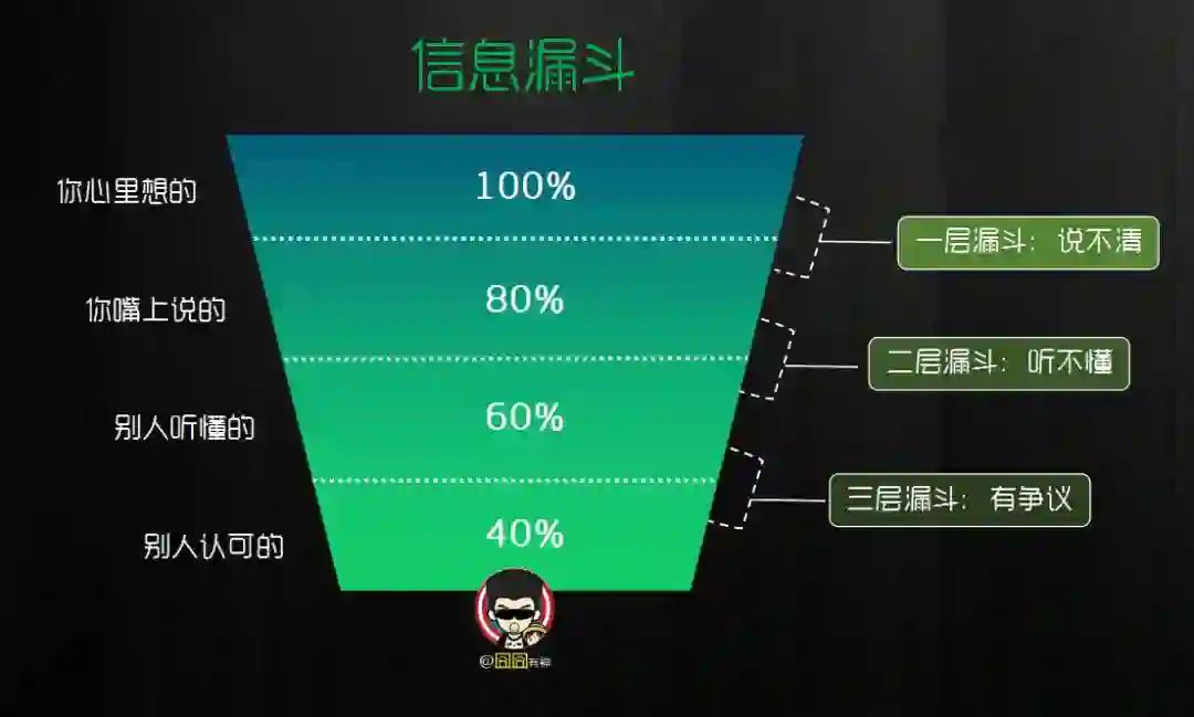 我们必须要承认在工作中的所有沟通,都是有信息衰减的,而且随着组织层级的增加,人数的扩张,沟通效率会越来越低下,这也是团队管理中的硬伤,会按照下面的漏斗,越来越失真。