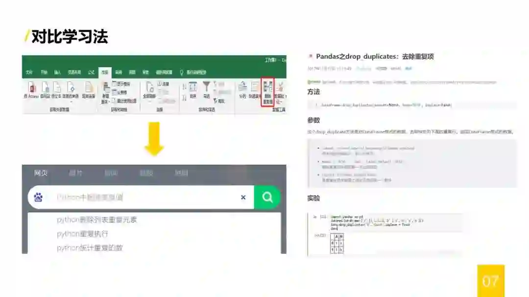 那既然不同工具达到的效果是一样的,我是不是就可以对比着我比较熟悉的Excel操作去学习Python,比如说我想要对一个表进行删除重复值处理,但是因为数据量太大了,Excel处理不了,这个时候我就可以利用python去处理,可是我又不会python删除重复值可怎么办呢,最简单的方法就是我直接去百度搜索一下python删除重复值怎么实现,然后就会出来很多教程,然后随便点开一篇就会有对应的方法,我找到的一篇就是右面截图这个,里面讲了用什么方法,这个方法里面有什么参数,还有实例,我一看马上就知道怎么用Python来删除重复值了。