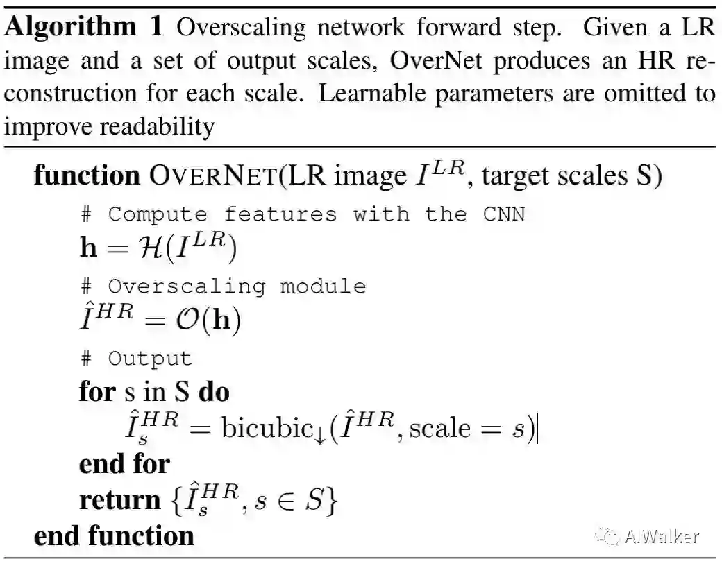 为生成更精度且更少伪影的图像,作者提出了提出了过尺度模块,它基于这样的假设:过尺度可以为同一像素生成更多的值,这些值可以起到集成的作用,进而可以降低噪声。假设N为最大超分尺度,作者首先过尺度特征 ,它的分辨率尺度为 。因此,基于所提取的特征h,作者采用3x3卷积+pixelshuffle得到过尺度特征: