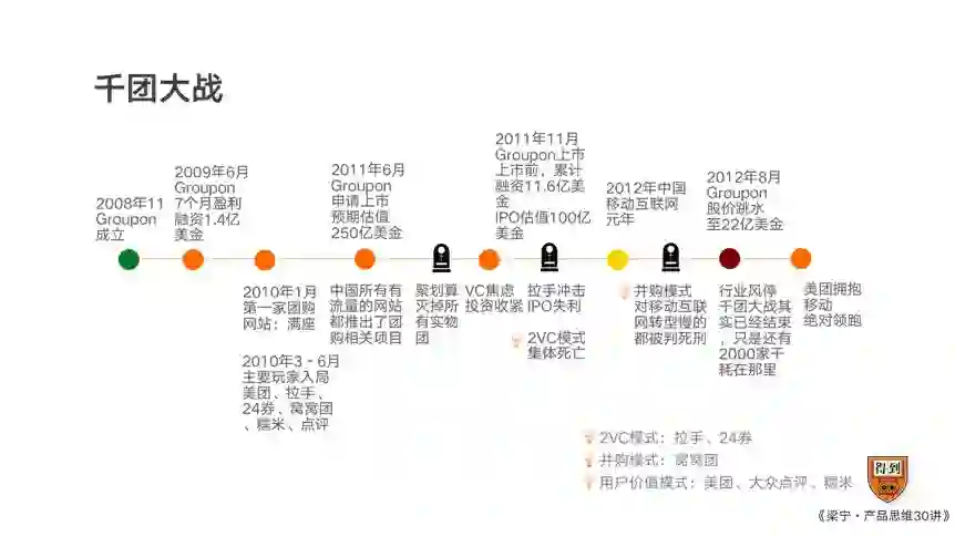 上面两种模式,2VC的创业者被VC抛弃了,出局;没能拥抱移动互联网的,被闪腰了。所以,直到2012年团购的风口关了,美团开始领跑这个板块。