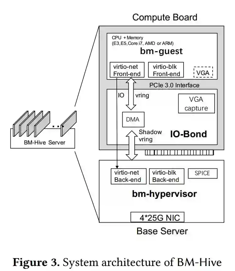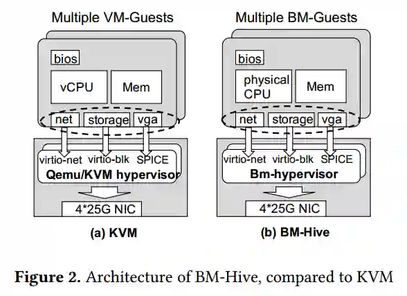 在本文中,我们提出了一种创新的高密度多租户共享弹性裸金属服务器的设计,也就是阿里云神龙弹性裸金属架构(论文中为了满足评审的要求称为BM-Hive)。在阿里云神龙高密裸金属架构中,每个裸金属实例都运行在一个单独设计的计算子板上,该计算子板带有专有的 CPU 和内存模块。BM-Hive为每个计算子板配备了硬件/软件混合 virtio I/O 系统,使客户实例能够直接访问阿里云网络和存储服务。BM-Hive 可在单个物理服务器中托管多达 16 个裸金属实例,显著提高裸金属服务器的实例密度。此外,BM-Hive 在硬件级别严格隔离每个裸金属实例,以提高安全性和隔离性。神龙弹性裸金属高密方案已经在阿里云的公共云部署。它目前同时为百万级用户提供服务。