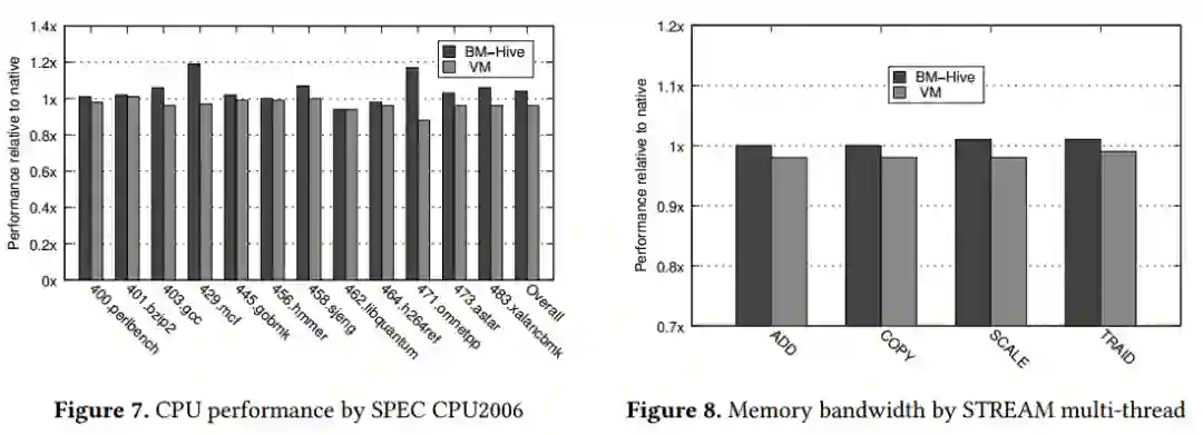 裸金属实例的本地CPU和内存性能对用户至关重要。图7和8呈现了相同配置下,裸金属实例与虚拟化实例在运行SPEC CINT 2006测量的CPU性能差异,用STREAM工具测试内存性能的差距。