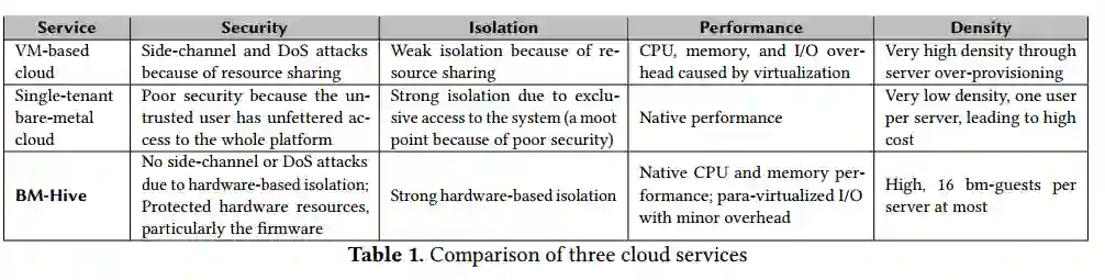 虚拟化是云计算的基石,多租户(Virtual Machines)共享一个物理服务器,提高了数据中心服务器的利用率,使得云计算服务商可以提供更经济高效的服务。但是,虚拟化下多VM共享物理服务器的技术会引入不少安全问题,尤其是最近的侧通道攻击等。此外, CPU、内存和 I/O 在虚拟化性能方面会产生不可忽略的开销。为此,物理服务器租赁已成为公共云中新兴的服务类型,物理服务器租赁为用户提供了强大的隔离性、对硬件的全面和直接访问以及更可预测的性能。但是物理服务器租赁的方式也有其缺点:它只能针对单租户,且不具备可扩展性、成本又高,适应性弱。当前物理服务器租赁只能将整个物理服务器租给单个用户,并且在租用服务器后用户无法方便的替换镜像,存储等云计算的基本服务。