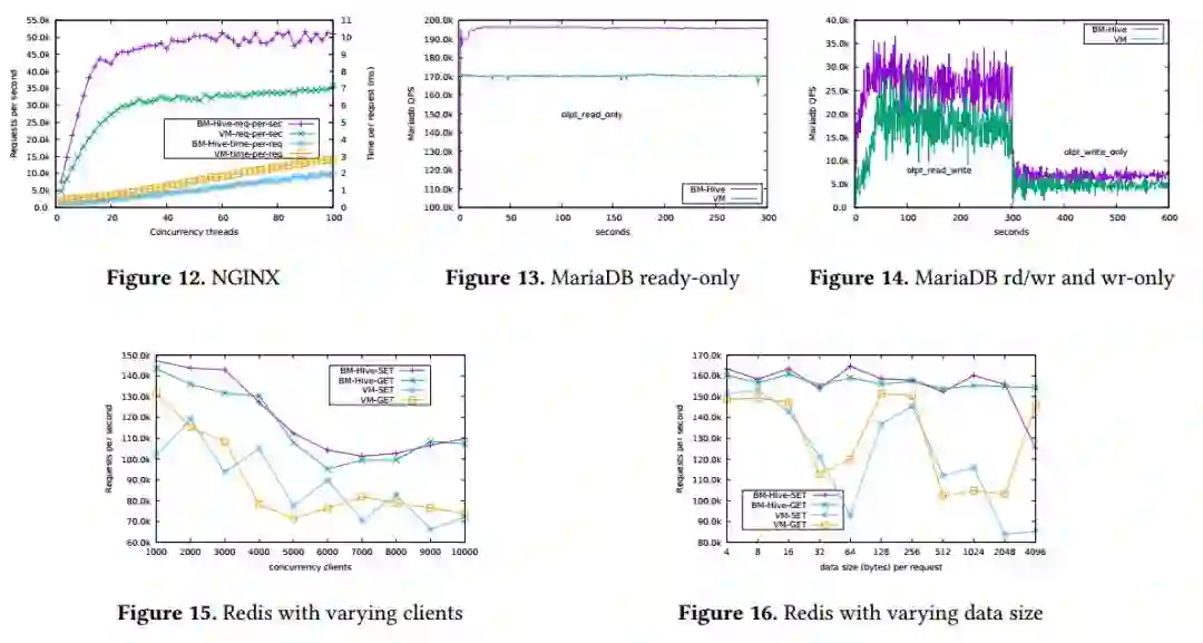 Nginx:大多数客户选用的网站服务类型。BM-guest的每秒请求数与每请求处理时间等方面都要优于VM-guest 50%以上