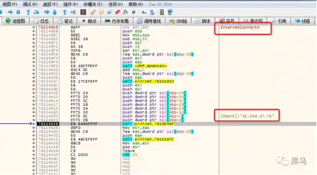 通过动态调试获取shellcode 调用的函数名字:
