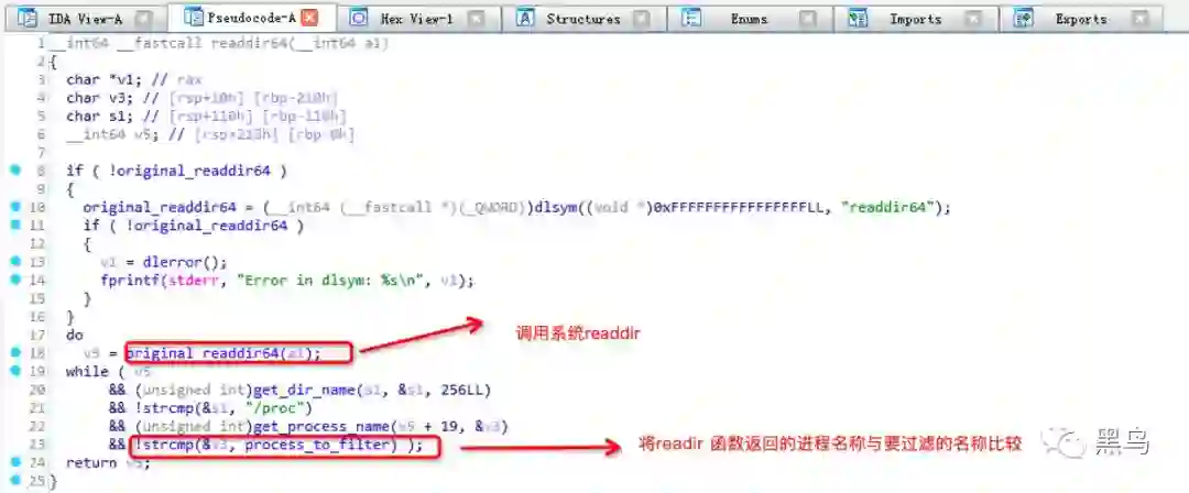 当readdir函数被调用时,先调用系统的readdir函数,在readdir返回的进程名字里面去比较进程名字是否含有”proxy”,如果是proxy进程,则不将readdir的结果返回给调用者,以此达到隐藏进程的目的。