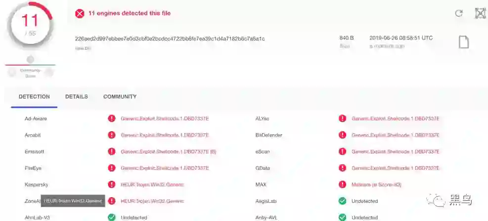 通过 virustotal 信息可以看到,国内所有杀软对此shellcode 文件都无检
