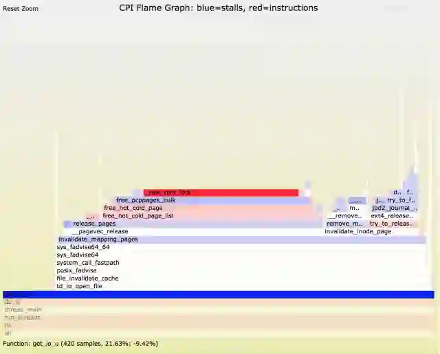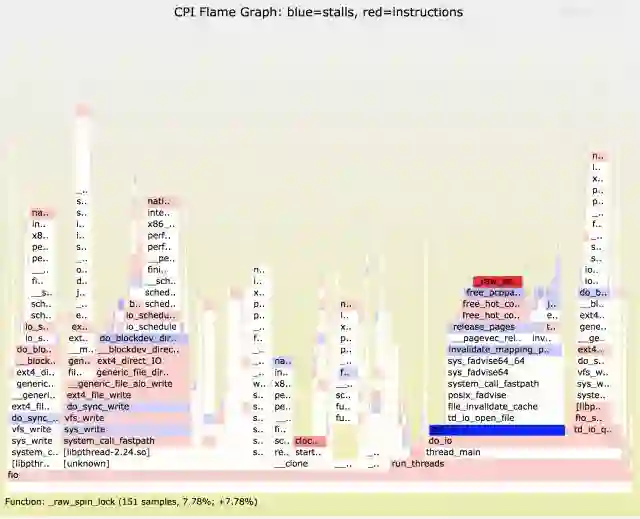 现在,我们可以使用 CPI 火焰图来分析一个略真实一些的测试场景。下面的 CPI 火焰图,来自 fio的测试场景。