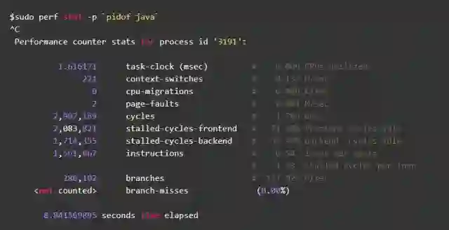 例如,下例就可以给出 Java 程序的 IPC,8 秒多的时间里,这个 Java 程序的 IPC 是 0.54: