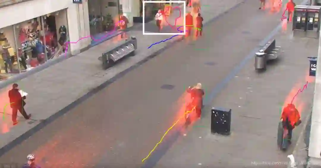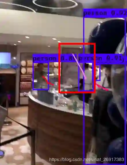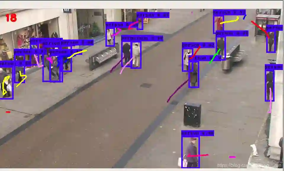 蓝色的框为检测到的人,每个框后面的线为移动轨迹。