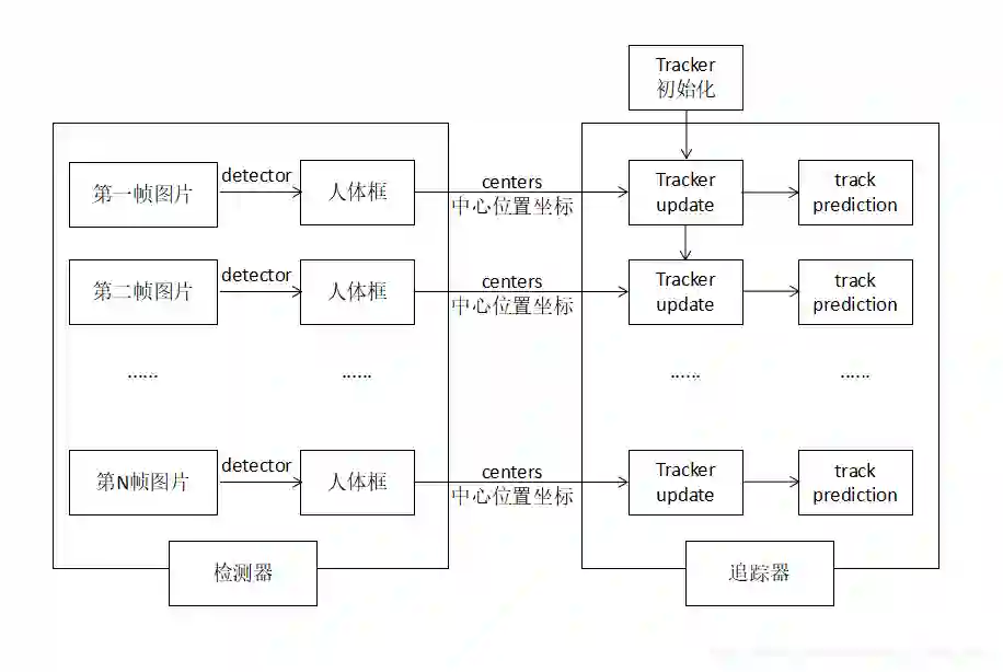 这是原作者画的一个草图,这里的流程就是,图片经过detector,得到人体坐标框,然后计算中心点位置centers(x0,y0),将该centers(x0,y0)输入给追踪器,追踪器去学习(Update)并给出预测。