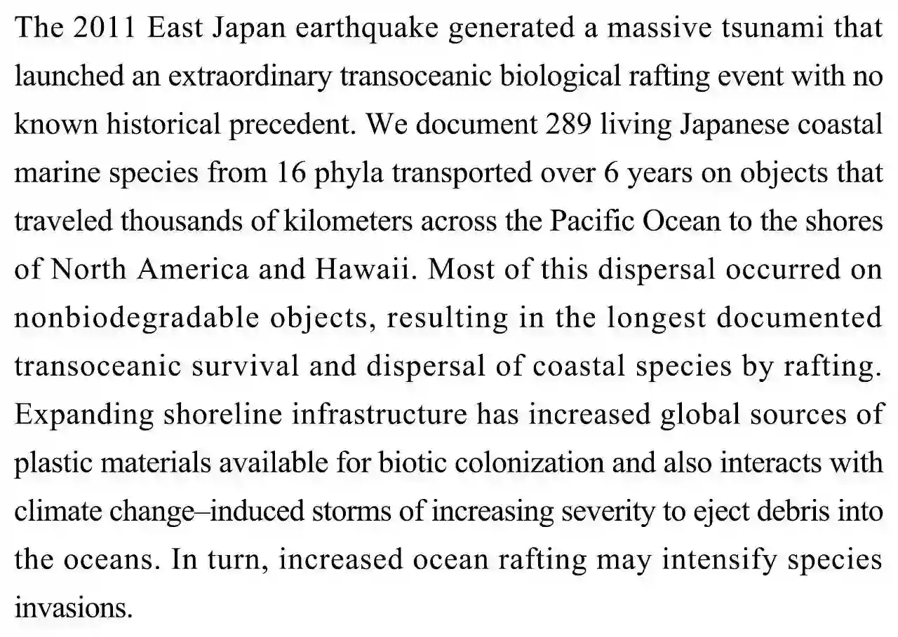 (导读 刘晓娟)2011 年日本地震引发的海啸造成了史无前例的生物越洋活动。研究记录了 6 年来日本海岸的 16 门 289 个物种越过太平洋到达北美和夏威夷海岸。大多数物种扩散通过附着在非生物降解物上实现,日益扩大的海岸带基础设施建设提供了大量非生物降解塑料。海洋风暴使得塑料碎片漂洋过海为物种扩散提供媒介,加剧物种入侵。
