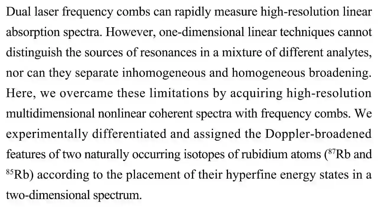 (导读 阿金)双激光频率梳能快速测量高分辨率线性吸收光谱,但一维线性技术还无法区分混合分析物的谐振源以及均匀和非均匀展宽。本研究成功结合高分辨率多维非线性相干光谱和光学频率梳,区别并标识出铷原子的两个同位素样品(87Rb 和 85Rb)的多普勒展宽特征。研究结果为高分辨率多维光谱的测量提供了重要参考。