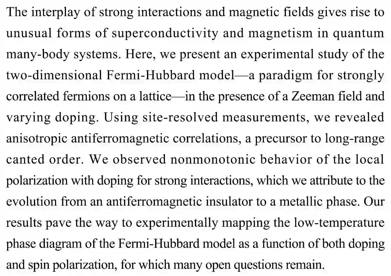 (导读 张奕林)强相互作用与磁场的影响带来了量子多体系统中独特的超导和磁性形式。本研究通过改变塞曼场和掺杂研究了晶格上的强关联费米子。借助位点分辨测量, 研究人员观察到了强相互作用局域极化与掺杂之间的非单调关系,并归因于反铁磁绝缘体到金属相的相变。研究结果有助于在实验上建立 Fermi-Hubbard 模型与掺杂和自旋极化的关系。
