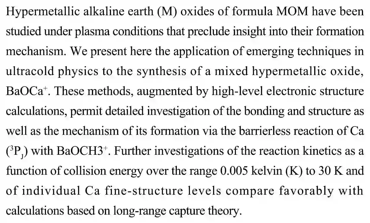 (导读 阿金)本研究使用最新的冷原子物理技术,并结合高性能电子结构计算方法,对人工合成碱土金属超金属氧化混合物 BaOCa+ 过程中化学键和结构的变化,以及 Ca(3PJ)和以BaOCH3+ 的无过渡态反应进行了详细的研究。反应过程中动力学参数与碰撞能量的关系,以及单个 Ca 精细结构也符合基于长程俘获理论的计算结果。