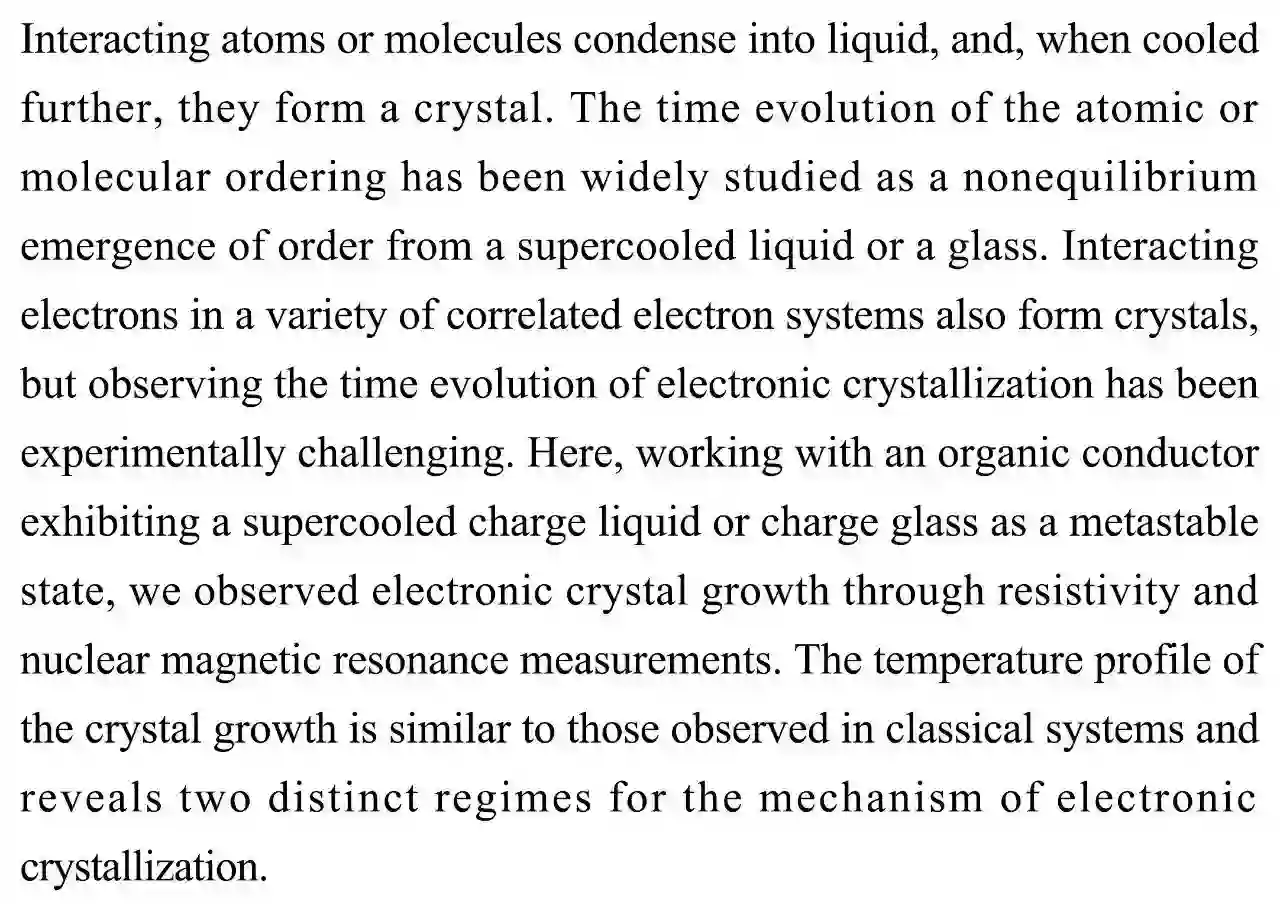 (导读 张奕林)尽管关联电子系统中互作用电子也会形成晶体,但观察电子晶体的时间演化在实验上一直是一个难点。本研究利用一种有机导体展示了过冷电荷液体或电荷玻璃是一种亚稳态,并通过电阻率与核磁共振谱测量观测了电子晶体生长中。结果显示晶体生长的温度特性与经典体系类似,揭示了电子结晶的两种独特机理。