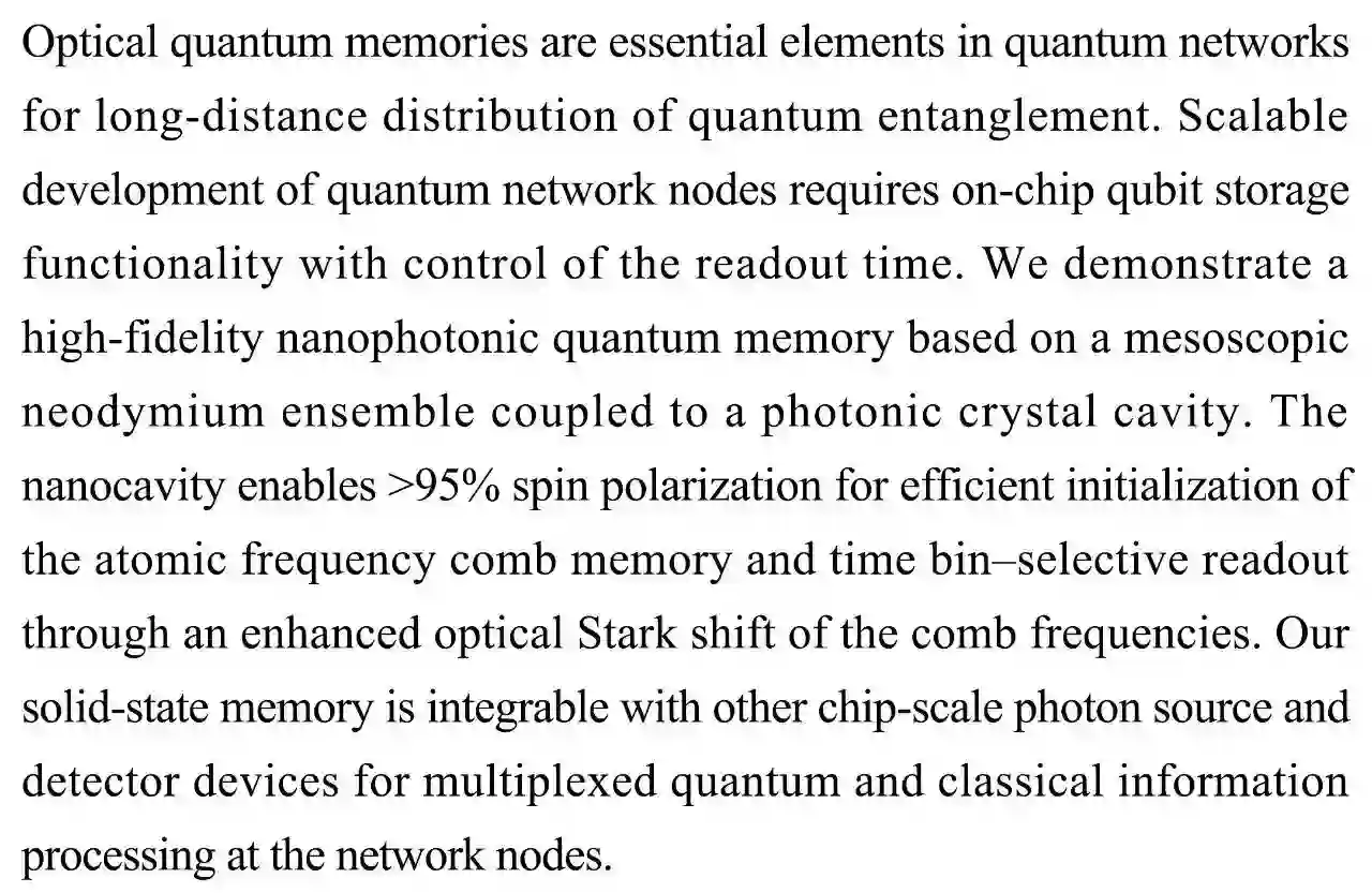 (导读 阿金)量子网络节点要求在读出时间可控的情况下在芯片上实现量子位存储功能。本研究将介观尺度上的钕元素与光子晶体共振腔耦合,展示了一种高保真纳米光量子存储器。器件的自旋极化程度超过 95%,得以有效初始化原子梳状频率和数据输出时间。研究结果为发展基于光量子网络的长距离信息传输提供重要参考。
