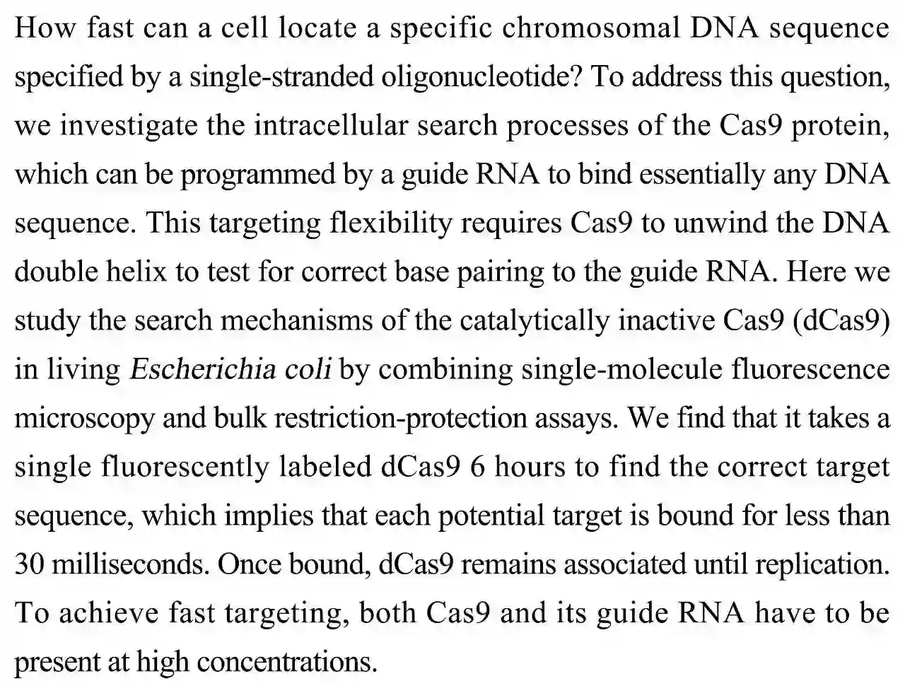 (导读 郭思瑶)为了探究细胞利用单链寡核苷酸定位染色体中 DNA 序列的速度,科研人员探究了 Cas9 蛋白利用先导 RNA 在大肠杆菌内的搜索过程。结果发现单个荧光标记的 dCas9 蛋白需要花费 6 小时找到正确的序列,这说明每个潜在目标被结合的时间不超过 30 毫秒。高浓度的 Cas9 和先导 RNA 是保证快速靶定的先决条件。