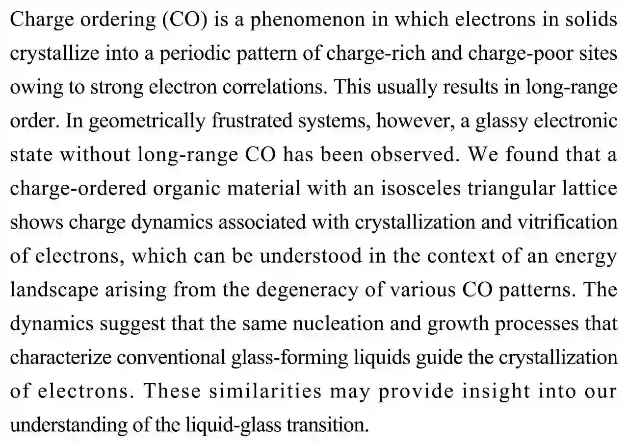 (导读 张奕林)由强电子关联效应引起的电荷有序化通常会导致长程有序。本研究在一个几何不稳定性系统中观察到了一个无长程电荷序的玻璃电子态,并发现有着等腰三角形晶格的电荷有序有机材料展现出与电子结晶与玻璃化相关的电荷动力学。研究结果有助于理解液相-玻璃相转变。