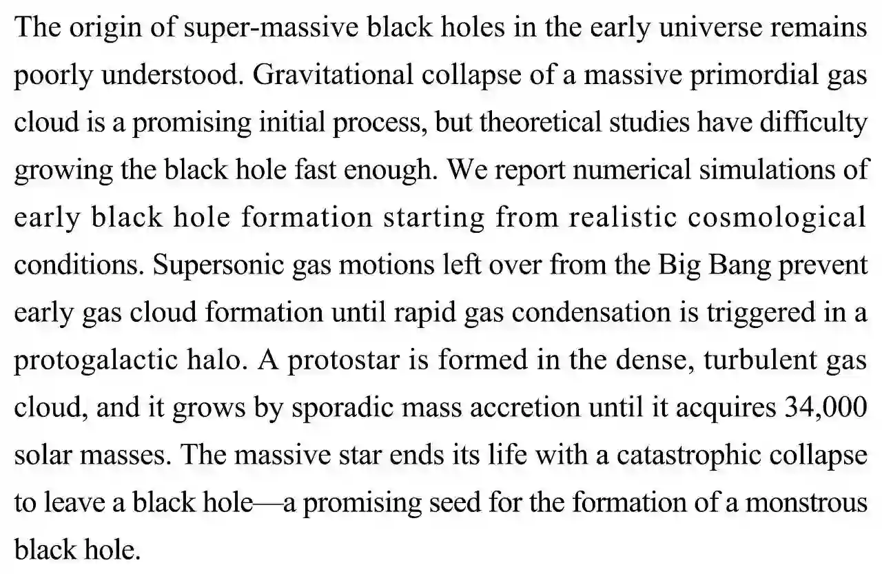 (导读 刘晓娟)目前学术界对于在宇宙初期形成的巨大黑洞了解仍然甚少。本研究对早期黑洞的形成进行数值模拟,得出从大爆炸中遗留下的超音速气体阻碍了早期气体云形成,直到原始星系光环中的气体凝结被触发。原恒星形成于稠密湍流的气体云,以零星的物质吸积方式达到 34000 个太阳质量,最后坍缩形成黑洞。