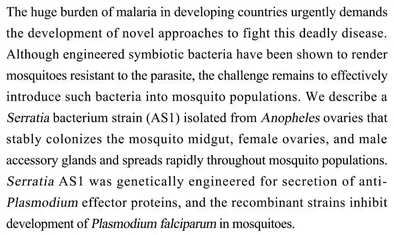 (导读 郭思瑶)本研究发现从按蚊卵巢中分离的沙雷氏菌属(AS1)可在按蚊中肠、雌性卵巢和雄性附性腺稳定繁殖定居,并迅速在蚊群中传播。通过基因编辑使 AS1 分泌抗疟原虫效应蛋白,重组菌可抑制按蚊中镰刀形疟原虫的侵染。这对于利用细菌抑制疟疾传播有重要意义。