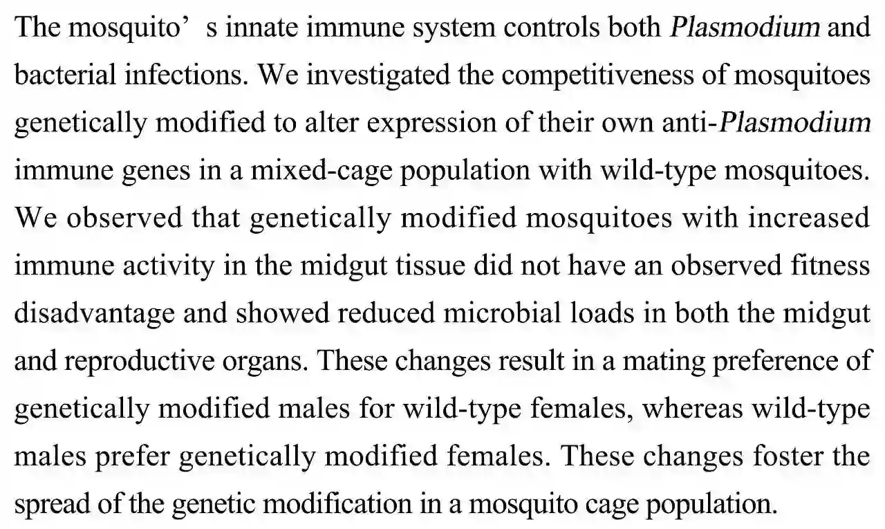 (导读 郭思瑶)按蚊的先天性免疫系统控制疟原虫和细菌感染。本研究改变了按蚊抗疟原虫免疫基因的表达,发现与野生型按蚊相比,基因编辑过的按蚊中肠的免疫活动增加,微生物侵染减少,适合度没有下降,使得雌雄基因编辑个体都较同性野生型个体更有交配优势,大大促进了基因编辑按蚊在蚊群中的扩散。
