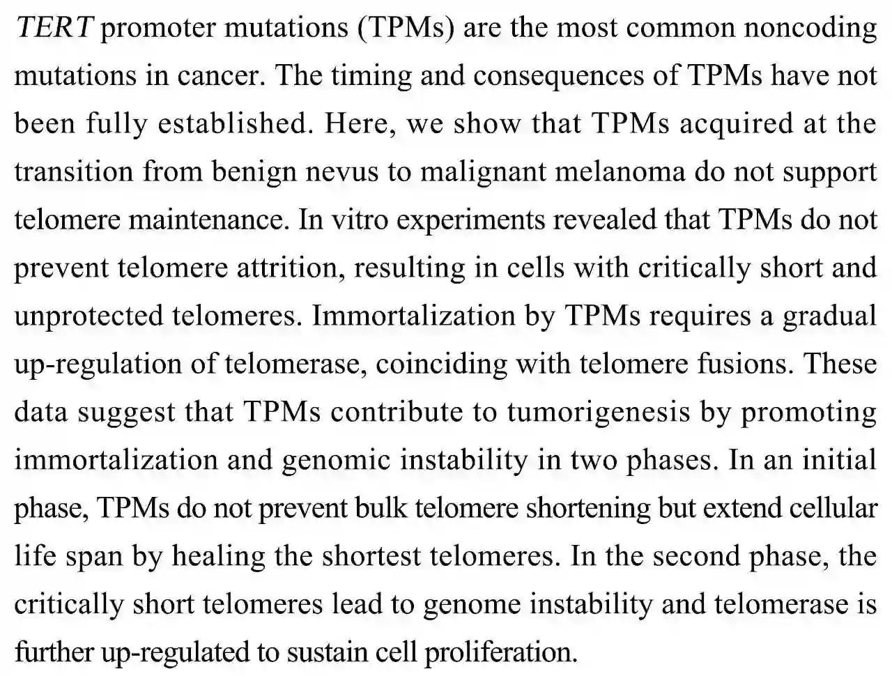 (导读 郭怿暄)端粒酶 TERT 启动子突变(TPMs)是肿瘤中最常见的非编码突变,然而对其致癌机制我们知之甚少。本研究发现 TPMs 在两个阶段通过促进细胞无限增殖化和基因组不稳定导致肿瘤发生:初始阶段,TPMs 通过增长最短端粒来延长细胞寿命;第二阶段,最短的端粒导致基因组不稳定,端粒酶表达进一步上调以维持细胞增殖。