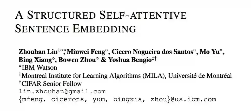 本文发表于 ICLR 2017,作者提出一个新的自注意力模型,能提取句子中的重要部分进行 embedding,是一篇可以直接看公式理解作者思路的论文。
