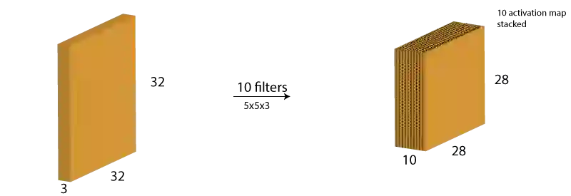 每一个过滤器的输出被堆叠在一起,形成卷积图像的纵深维度。假设我们有一个 32*32*3 的输入。我们使用 5*5*3,带有 valid padding 的 10 个过滤器。输出的维度将会是 28*28*10。