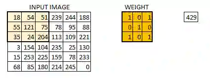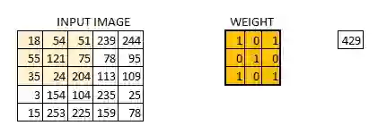 我们把权值初始化成一个 3*3 的矩阵。这个权值现在应该与图像结合,所有的像素都被覆盖至少一次,从而来产生一个卷积化的输出。上述的 429,是通过计算权值矩阵和输入图像的 3*3 高亮部分以元素方式进行的乘积的值而得到的。