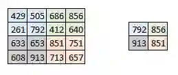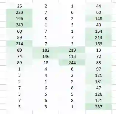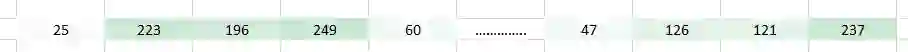 基本上,机器会把图像打碎成像素矩阵,存储每个表示位置像素的颜色码。在下图的表示中,数值 1 是白色,256 是最深的绿色(为了简化,我们示例限制到了一种颜色)。