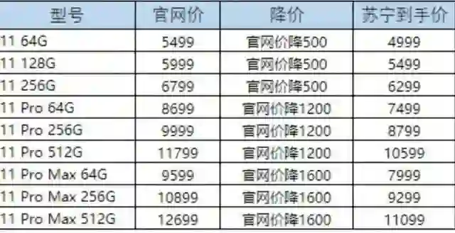 目前在苏宁易购官网,iPhone11 Pro Max各型号全部降价1600元,最低7999元就能入手;iPhone 11 Pro降价1200元,64G版本7499元;同时,iPhone11也降了500元,最低配64G版本售价4999元。此外,iPhone XR等上一代机型也有不同程度降价力度。