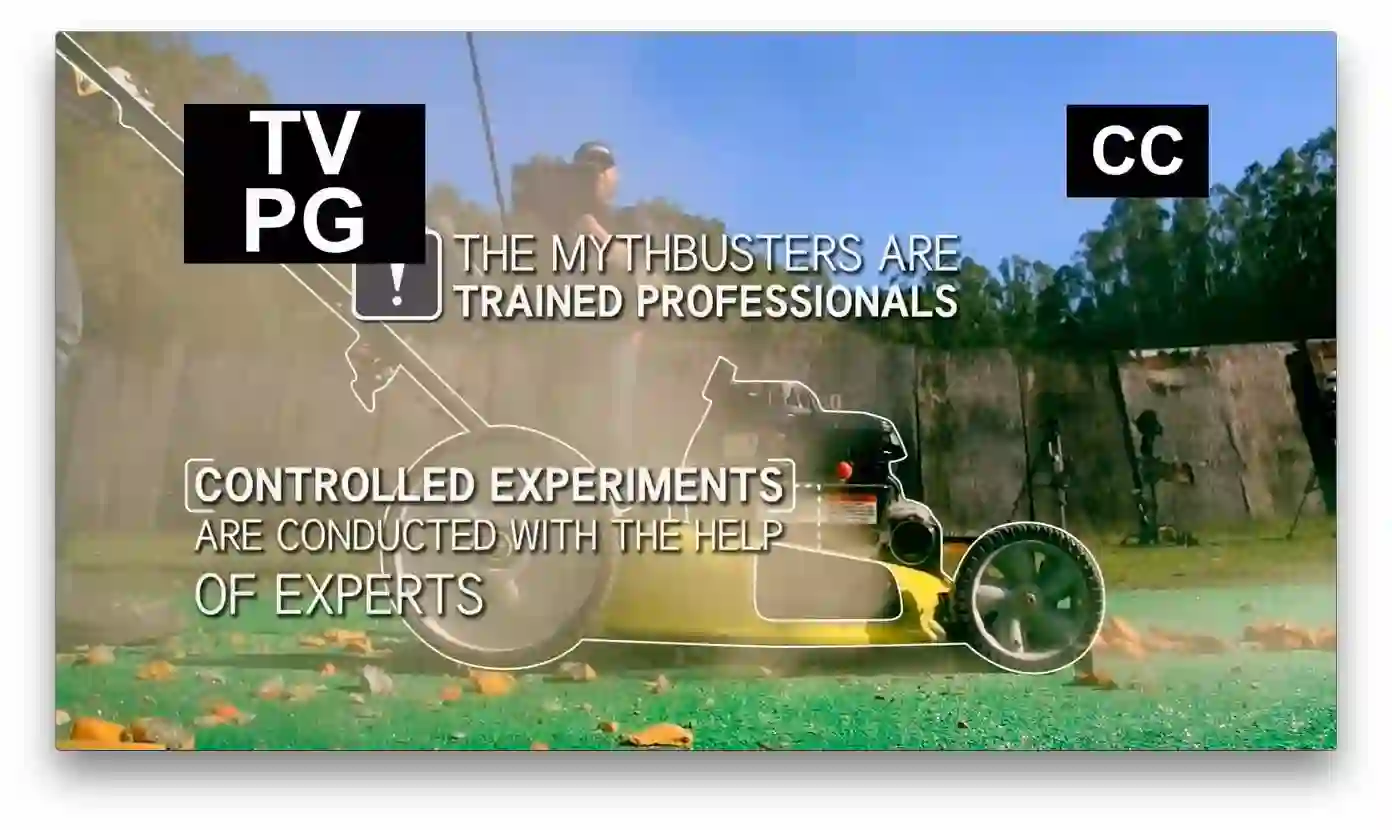 比如美国的「流言终结者」节目,除了你可以在上面看到「TV PG」分级标签以外,右上角也显示了 CC 标志标明本节目提供隐藏式字幕,你可以在电视上操作显示字幕,如果你不需要直接无视即可,这里便体现出了 CC 比较于一般字幕的优势。