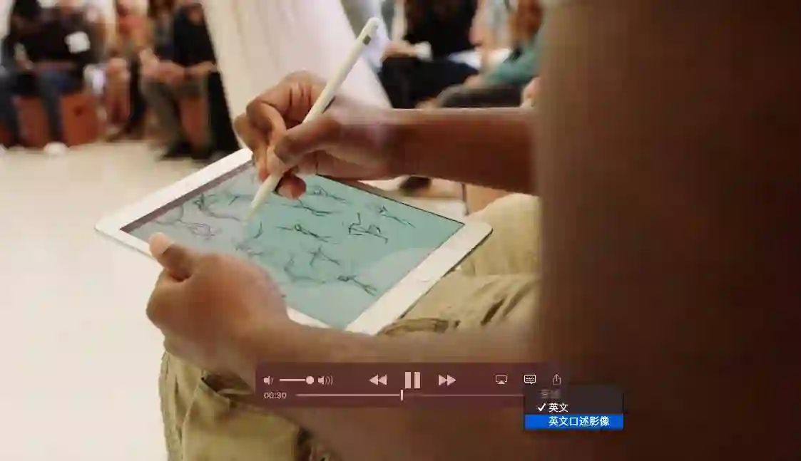 一些 Apple 的视频和 iTunes Store 电影还包括了 Audio Description,即口述影像,简写为 AD,它直接为你讲述画面正在发生的情节,与听力对应,AD 则是视力障碍人士的辅助功能。