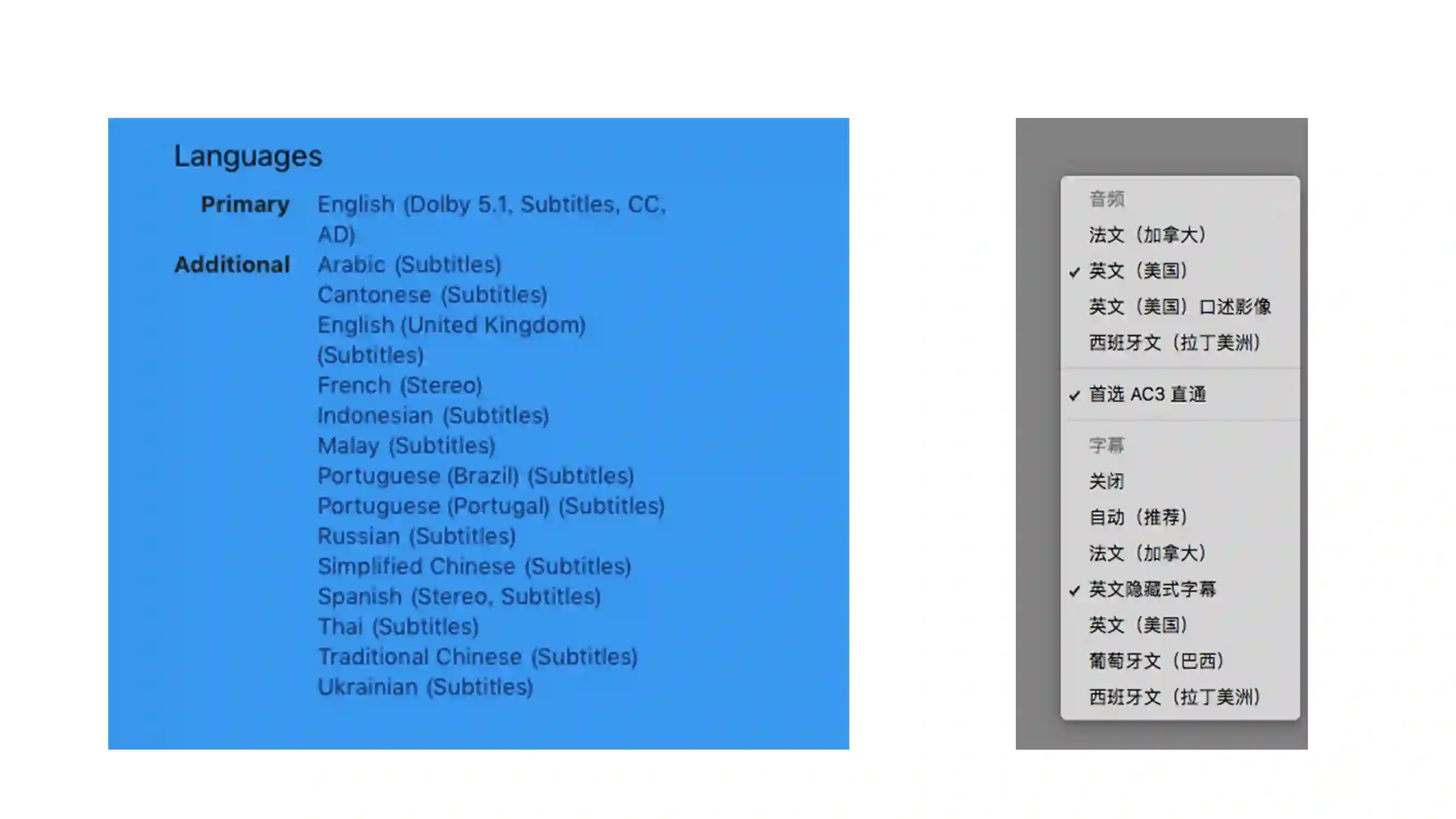 最新的蓝精灵电影在 iTunes Store 就提供了简繁中文和粤语的 Subtitles ,但不是 CC ,可以看到 Primary 英语提供 CC 和 AD 选项(后文介绍 AD )。右图中的《白日梦想家》在美国 iTunes Store 提供了加拿大式法文、西班牙文和英文音频,字幕则提供英语 CC 和法语、英语、葡萄牙语和西班牙语的普通字幕,普通字幕就与我们平时在电影上看到的是比较类似的,直接将文字盖在画面上。
