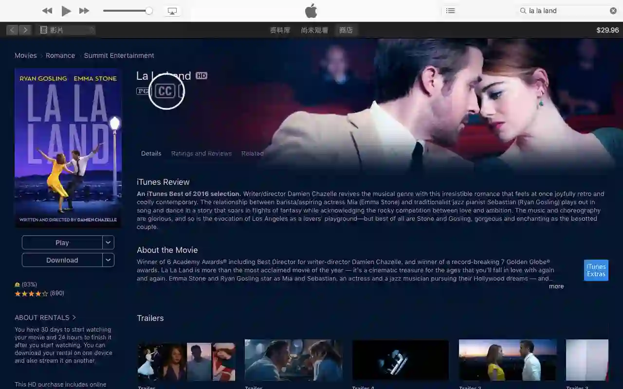 当你访问 iTunes 电影页面时,在影片名称下方除了分级,如果有 CC 标志则表明该电影伴随隐藏式字幕。