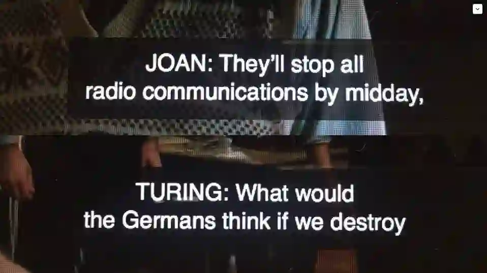 而 CC 也用不同的位置和「 >> 」等符号来辅助听力障碍人士理解复杂的语境,例如《模仿游戏》中,画面中没有的人物说话时字幕出现的位置与画面中人物说话时的不同,而画面中人物说话时 CC 会直接显示在他的身体附近。