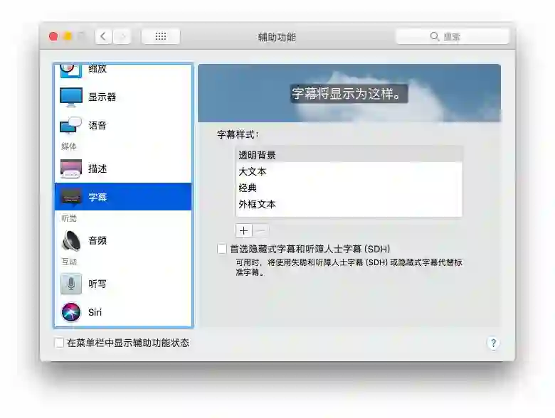 在 Mac 上你同样可以在系统偏好设置中更改这一设置。打开 SDH,系统将会自动在有字幕的时候打开,并且如果视频带有普通 Subtitles 和 Closed Caption , macOS 和 iOS 会帮你优先选择 CC 。