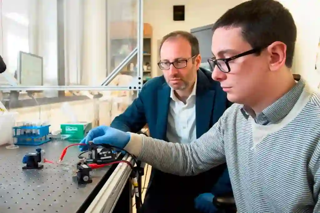 阿尔伯托·萨莱奥教授与研究生斯科特·基恩在研究用于神经网络计算的人工突触的电化学特性。(图片来源:L.A. Cicero)