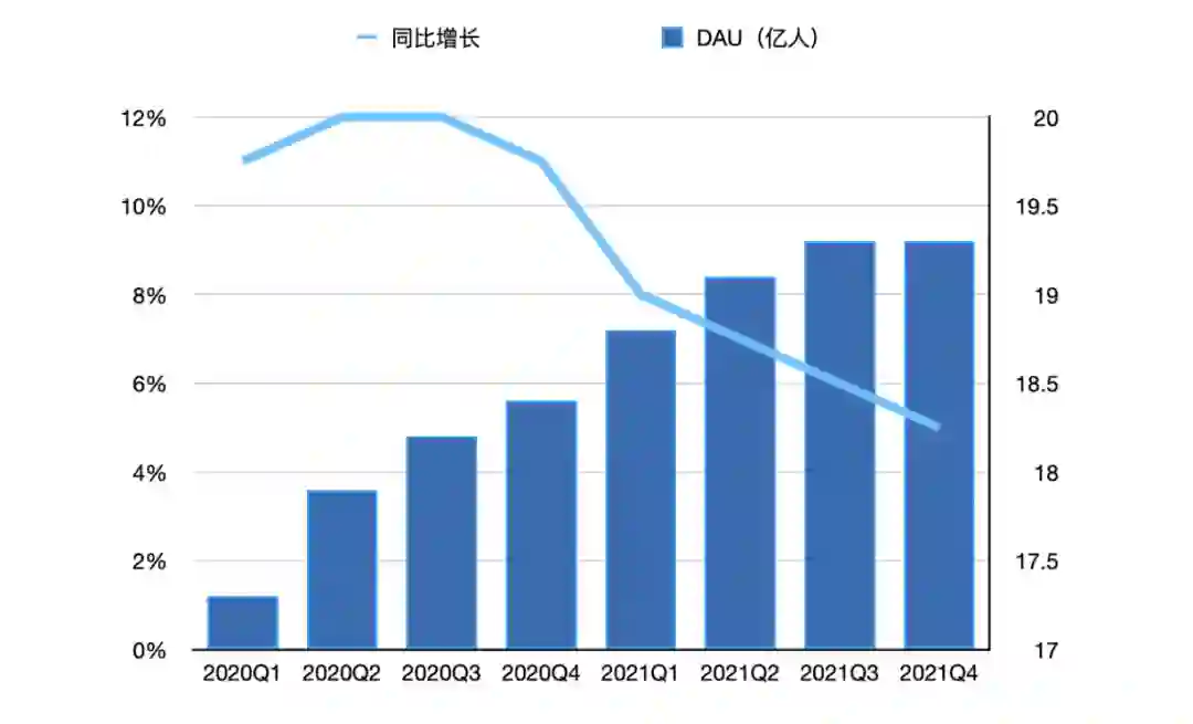 2020年二季度,Facebook的DAU及MAU同比增速均为12%,但去年四季度,两项指标分别下降为5%、4%。